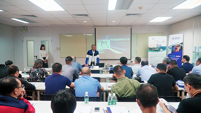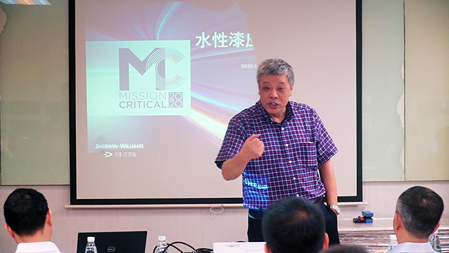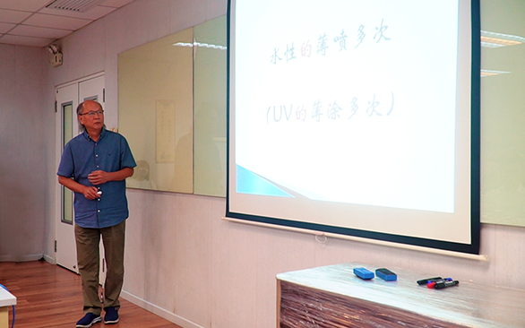 宣偉涂料技術應用部的培訓經(jīng)理蕭成滿先生現(xiàn)場分享《水性漆應用知識》,詳細講解水性漆的施工環(huán)境、使用注意、成膜過程、產(chǎn)品特點及施工注意事項等。