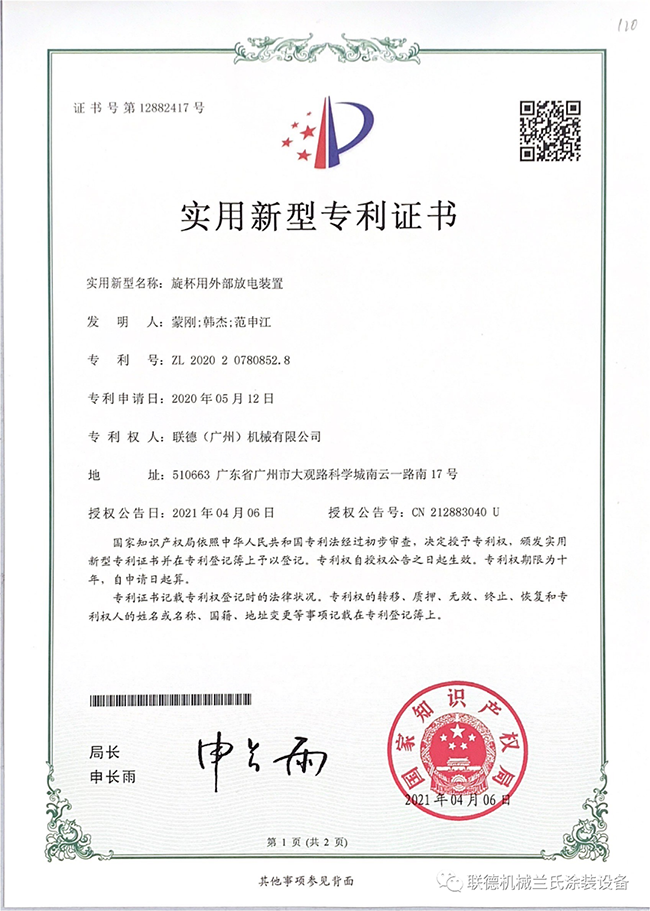 以上專利,是聯(lián)德靜電涂裝技術(shù)發(fā)展不斷提升的見(jiàn)證。