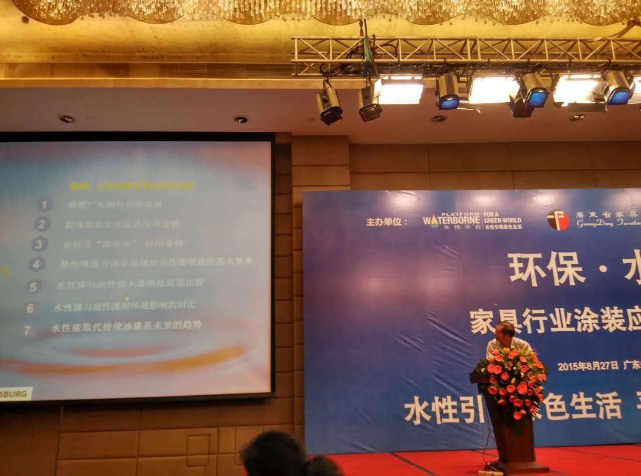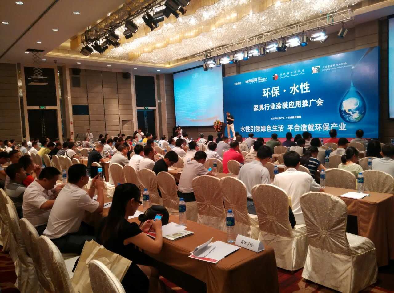 2015年8月27日,為積極推進(jìn)水性涂裝在家具行業(yè)的應(yīng)用,由中國化工學(xué)會(huì)涂料涂裝專業(yè)委員會(huì)水性涂料分會(huì)(簡(jiǎn)稱“水性平臺(tái)”)、廣東省家具協(xié)會(huì)、和廣東省涂料行業(yè)協(xié)會(huì)一起主辦的“環(huán)保·水性,家具行業(yè)涂裝應(yīng)用推廣會(huì)”在順德金茂華美達(dá)酒店順利召開。會(huì)議圍繞廣東省地方環(huán)保政策、廣東省家具和涂料市場(chǎng)的發(fā)展?fàn)顩r、水性涂料和涂裝的技術(shù)應(yīng)用等方面展開,以家具產(chǎn)業(yè)上下游聯(lián)動(dòng)的形式做了交流。共計(jì)250位嘉賓參加了會(huì)議,包括上游涂料供應(yīng)商、設(shè)備供應(yīng)商和下游家具制造企業(yè)、行業(yè)媒體等。參會(huì)的領(lǐng)導(dǎo)包括:廣東省環(huán)保廳大氣監(jiān)測(cè)與科技標(biāo)準(zhǔn)處王大力副處長;水性平臺(tái)理事長裴忠華;廣東省家具協(xié)會(huì)會(huì)長王克、秘書長張承志;廣東省涂料行業(yè)協(xié)會(huì)會(huì)長黃開、秘書長呂水列、主任黃永漢;佛山市家具行業(yè)協(xié)會(huì)秘書長褚福戰(zhàn);中山市家具商會(huì)秘書長鄧廣森;順德涂料商會(huì)會(huì)長胡景釗等。